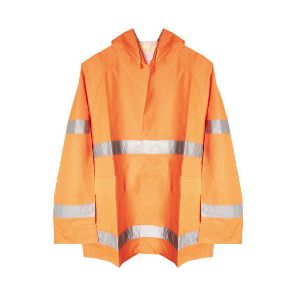- Giacca colore arancio fluo con bande grigie con cappuccio, bottoni e due tasche anteriori