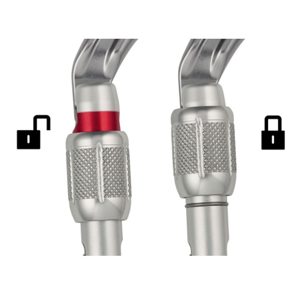 – SCREW-LOCK: bloccaggio manuale a vite con indicatore visivo rosso quando il moschettone non è bloccato. - Disponibile anche in versione nera (versioni TRIACT-LOCK e SCREW-LOCK).